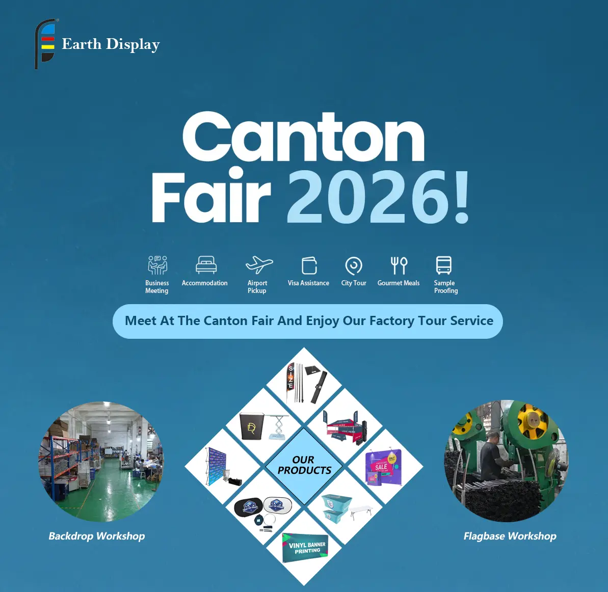 2026 Canton Fair လာပါပြီ၊ Earth Display မှာ မင်းကိုတွေ့ဖို့ တကယ်မျှော်လင့်ပါတယ်။ ကျွန်ုပ်တို့သည် အမွေးအလံများ၊ ပေါ်လာသည့်နောက်ခံများ၊ အလံအုတ်များ၊ စိတ်ကြိုက်ဗီနိုင်းနဖူးစည်းများ—ပြပွဲနှင့်ကြော်ငြာများအတွက် အခြေခံအားဖြင့် မည်သည့်အရာမဆို—ယခုဆယ်နှစ်ကျော်ကြာအောင် ပြုလုပ်နေပါသည်။ ဒီတစ်ခါတော့ အွန်လိုင်းမှာပြောနေမယ့်အစား မျက်နှာချင်းဆိုင်ပြီး ဘာတွေလုပ်တယ်ဆိုတာကို ပြချင်ပါတယ်။