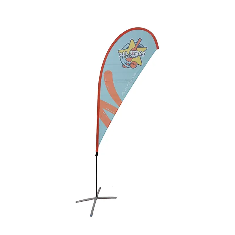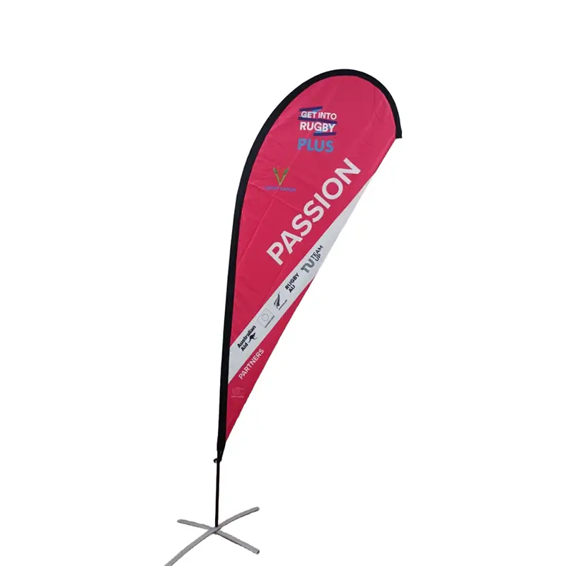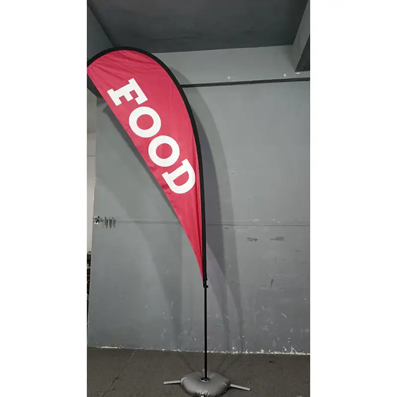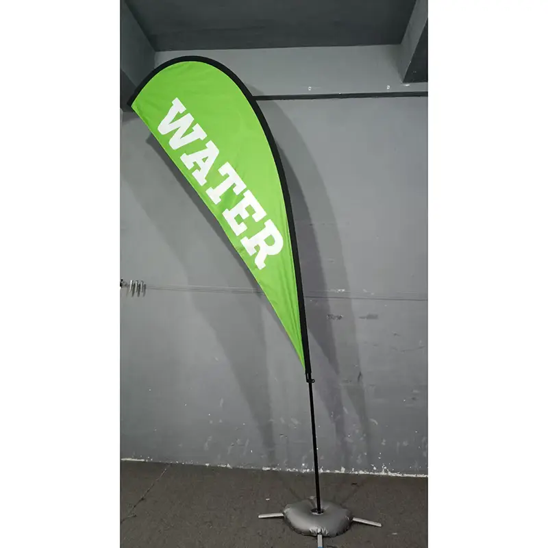 Teardrop ကမ်းခြေအလံကို အလူမီနီယမ်၊ ဖိုက်ဘာမှန်နှင့် ကာဗွန်ဖိုက်ဘာ ပစ္စည်းသုံးမျိုးဖြင့် ပြုလုပ်နိုင်သည်။